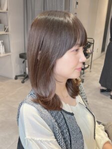 暗髪の安心感と、透明感カラーの軽さを両立した色味。