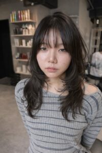 2026/03/01 重く見せない前髪と、顔まわりのレイヤーで自然に小顔に見せるスタイル。前髪は薄めに設定して抜け感を出しつつ、サイドに流れる毛束で輪郭をカバー。結んだ時も顔まわりが残るように計算しています。「前髪ありにするか迷っている」「幼くなりたくないけど雰囲気は変えたい」そんな方におすすめです。カラーは暗めでも重く見えないように、ツヤと柔らかさを重視。似合わせは骨格とバランスがすべて。ぜひ一度ご相談ください。