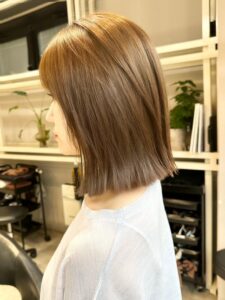 赤みをしっかりカットしながら、透明感のあるベージュで仕上げたワンレンボブ。